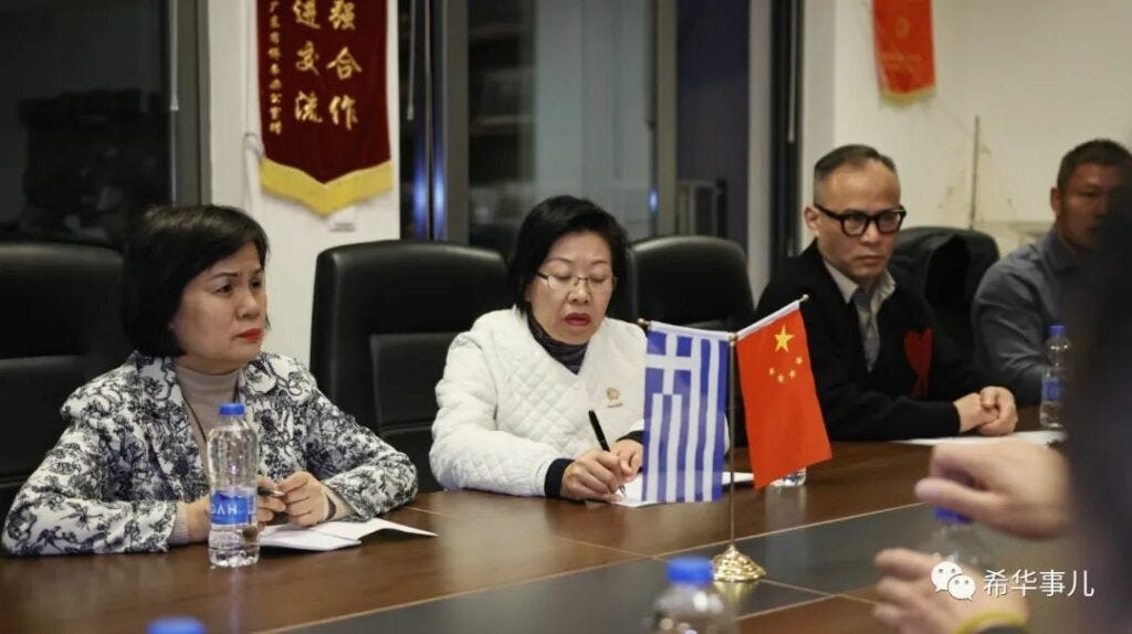 Liste des associations présentes pendant la visite, for the record: [希腊华侨华人总商会、希腊华侨华人总会、希腊华侨华人妇女会、希腊中国和平统一促进会、希腊华侨华人福建联合总会、中希友好华侨华人协会、希腊华人旅游业联合会、希腊青田同乡会、希中工商联合总会负责人和代表参加了此次座谈会].