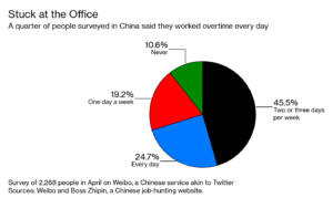 En Chine, veiller tard à son travail n’a rien de surprenant. Si les droits des travailleurs ont évolué dans la société chinoise (la loi du travail fixe le temps légal à 8 heures quotidiennes et 44 heures hebdomadaires[1]), l’écart entre la prescription légale et son application demeure considérable, et de nombreuses entreprises incitent leurs salariés à travailler au-delà du temps réglementaire. Espaces de loisirs mis gratuitement à disposition, remboursement des taxis pour rentrer à son domicile aux heures tardives, repas offerts… de nombreux avantages sont proposés aux valeureux travailleurs qui occupent leur bureau tard le soir, et parfois après la limite imposée par le rythme du « 996 ».