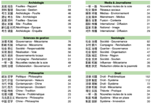 Mais pour autant, les autres sciences humaines et sociales ne sont pas oubliées : la linguistique, la littérature chinoise, l’histoire chinoise, la sociologie et la philosophie suivent de près dans le classement. Ces disciplines sont par ailleurs bien représentées au sein des universités dominantes (voir le graphique suivant). En outre, les sujets de recherche ne se limitent pas qu’au vocabulaire politique officiel employé. On étudie par exemple :