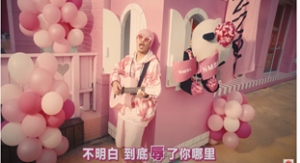 Dans un décor on ne peut plus rose – de la tenue sexy de Kimberley Chen au bonnet et à la guitare de Namewee, en passant par leurs lunettes en forme de cœur, les murs, le mobilier et les grappes de ballons disséminées un peu partout –, le morceau commence sur ces mots :