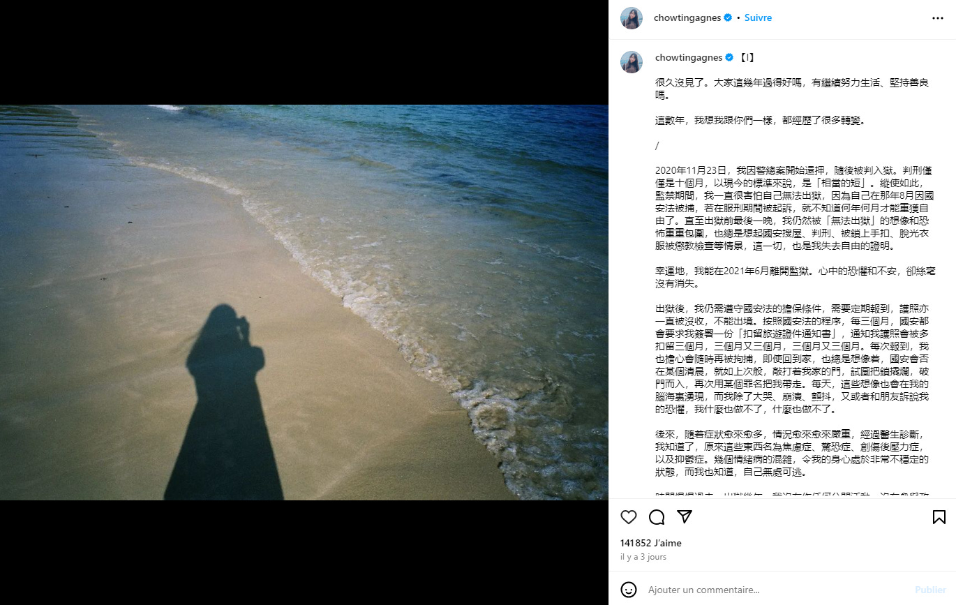 Une autre personnalité pan-démocrate de Hong Kong, en liberté sous caution, a annoncé son exil : Zhou Ting [周庭 / Agnès Chow], l’ancien secrétaire général adjoint du Demosisto [香港泛民主派] de Hong Kong – fondé en 2016, dissout en 2020 par le PCC.