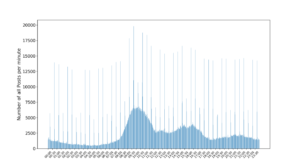 En termes d’analyse, les données temporelles sont les plus intéressantes. En effet, certains comptes affichent des pics de publication très nets toutes les demi-heures. Cette activité suggère l’utilisation d’un programme informatique pour automatiser les publications. Ce qui est d’autant plus intéressant, c’est que tous les comptes gérés de cette façon, par des bots, ne postent pas toutes les demi-heures, mais toutes les demi-heures, une partie d’entre eux est active (cf ci-dessous).