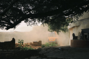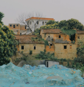 Six mois se sont écoulés depuis la demande officielle de démolition du village de Dashe. Les bulldozers rasent les maisons encore debout, et celles tombées sont recouvertes de filets verts. La quasi-totalité des résidents ont été évacués, seul un vieil homme vivant dans les décombres refuse de partir. C’est cet homme qui a indiqué le chemin à Xiao Shui. Le sol est jonché de débris et d’éclats de verre et la nature a déjà commencé à reprendre ses droits. L’endroit à l’air tout droit sorti d’un film post-apocalyptique.